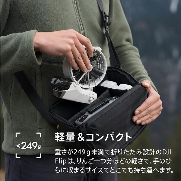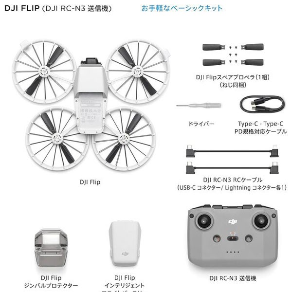 | 付属品 | DJI Flip インテリジェント フライトバッテリー*1, DJI Flip ジンバル プロテクター*1, DJI Flip*1, DJI Flipスペアプロペラ(1組)(ねじ同梱) *1, DJI RC-N3 RCケーブル(Lightningコネクター)*1, DJI RC-N3 RCケーブル(USB-Cコネクター)*1, DJI RC-N3*1, Type-C - Type-C PD規格対応ケーブル*1, スクリュードライバー |