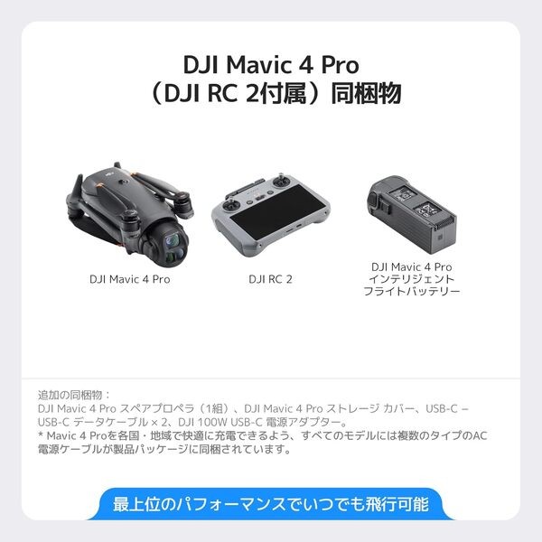 | 付属品 | DJI 100W USB-C 電源アダプター x 1, DJI Mavic 4 Pro x 1, DJI Mavic 4 Pro インテリジェント フライトバッテリー x 1, DJI Mavic 4 Pro ストレージ カバー x 1, DJI Mavic 4 Pro スペアプロペラ(1組), DJI RC 2 × 1, USB-C − USB-C データケーブル x 2 |